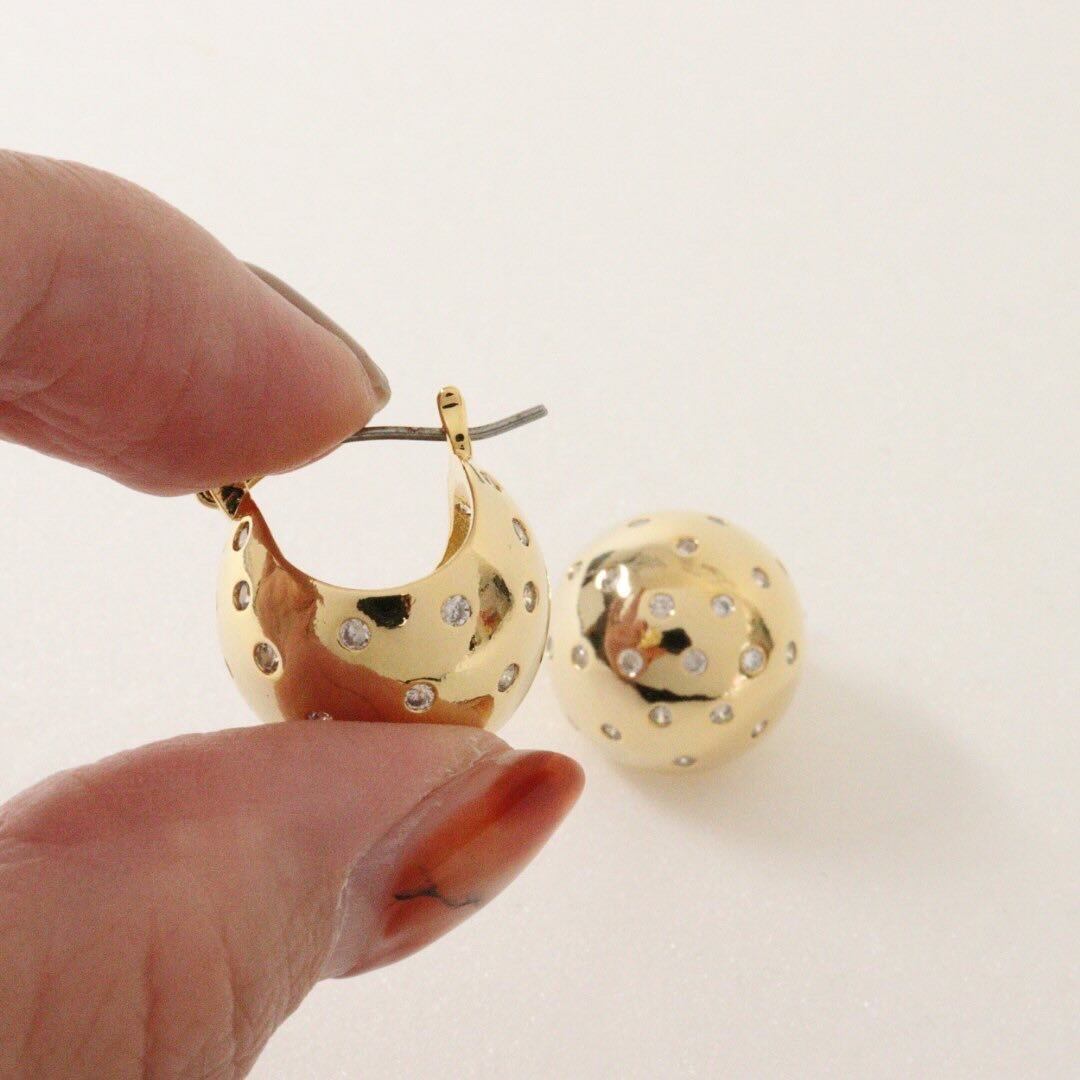 集まる光の中で輝く、キラキララインストーンの付いたまんまるデザインピアス。